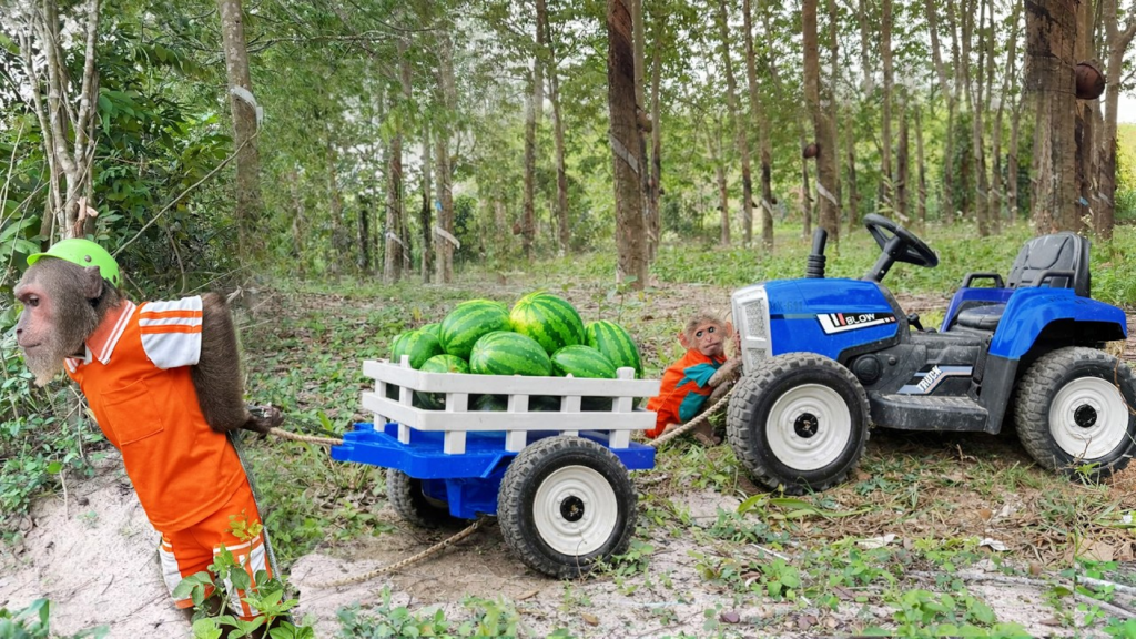 Dad brought a small farm car so they could carry the heavy watermelons back to the house. “Alright team,” Dad said with a smile, “let’s pick the best ones!” CUTIS and Buem carefully searched through the vines, tapping the watermelons just like Dad had taught them. When they found one that sounded perfect, they gently lifted it together and carried it to the car.