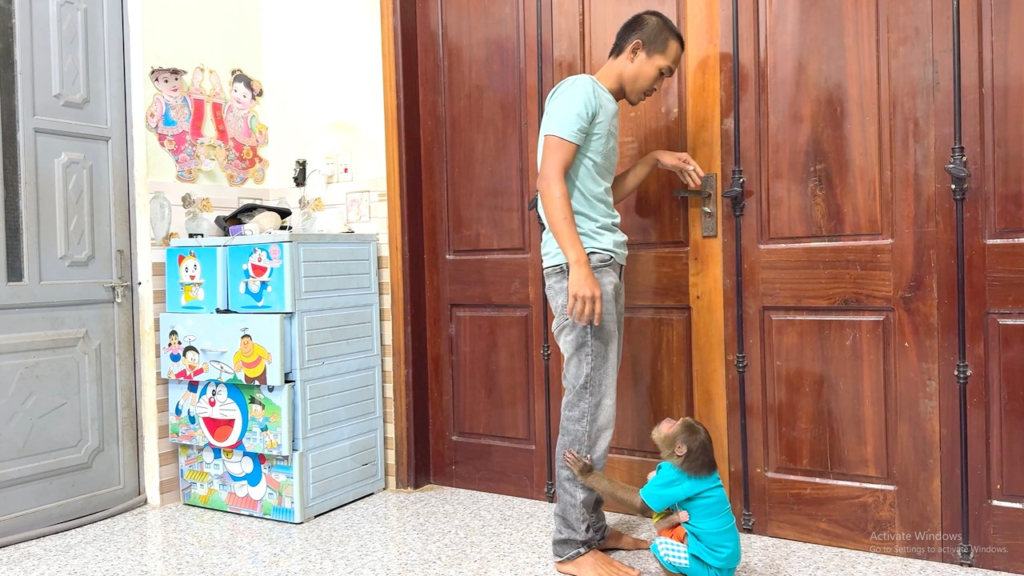 Seeing their reactions, Dad began to act even sillier. He tiptoed across the floor, pretending to be a sneaky monster, making funny noises and exaggerated faces. CUTIS burst into laughter, and Baby Monkey quickly forgot her fear, clapping her hands with delight. The room filled with giggles, echoing through the quiet house.