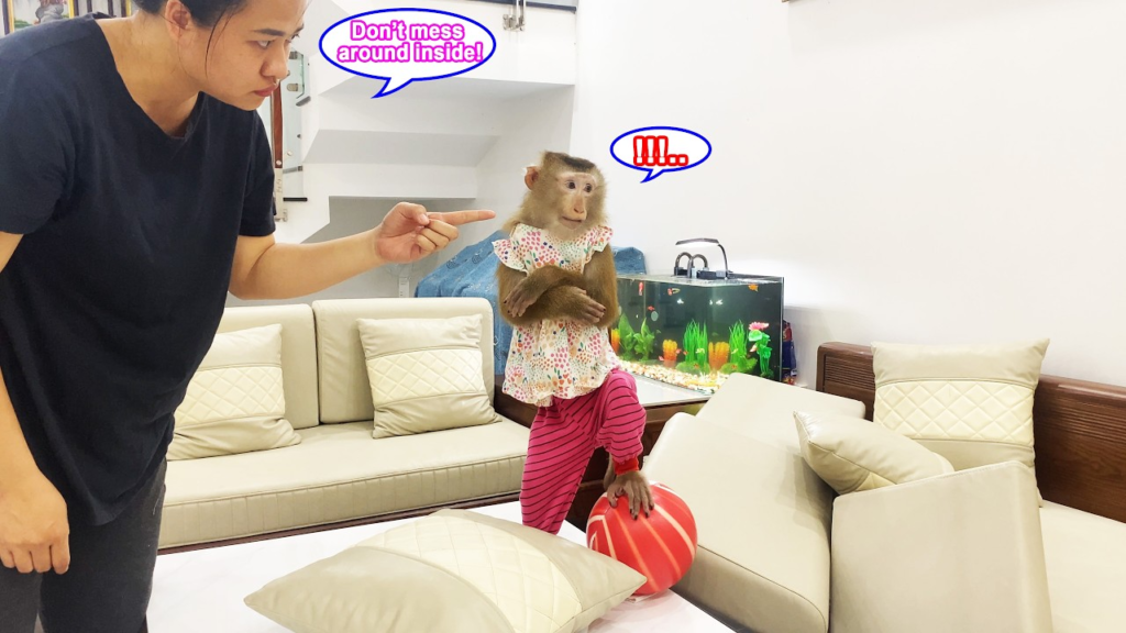 It was a bright and cheerful morning, and Monkey Lyly was already up to something. While Mom was busy in the kitchen preparing breakfast, Lyly quietly tiptoed into the living room with a curious grin. She spotted a basket full of colorful toys and, within seconds, began tossing them all over the floor. One by one, cushions were thrown, books were opened and scattered, and even a jar of crayons was knocked over, rolling in every direction.