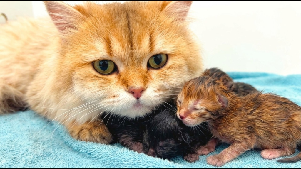 Soon, the first tiny kitten was born. It was so small, wet, and fragile, yet full of life. Zlata immediately began cleaning the baby with loving licks, helping it breathe and stay warm. Not long after, another kitten arrived, then another, until a beautiful little family of fluffy newborns lay curled beside their mother.