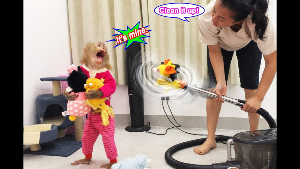 The house was quiet until the familiar roar of Mom’s vacuum cleaner filled the air. To most, it was just another day of cleaning, but to little Lyly the monkey, it sounded like danger approaching. The moment the machine rolled across the floor, Lyly’s bright eyes widened. Her tiny hands clutched her favorite toys, and she let out a worried squeak, as if to say, “Mom… stop right now!”