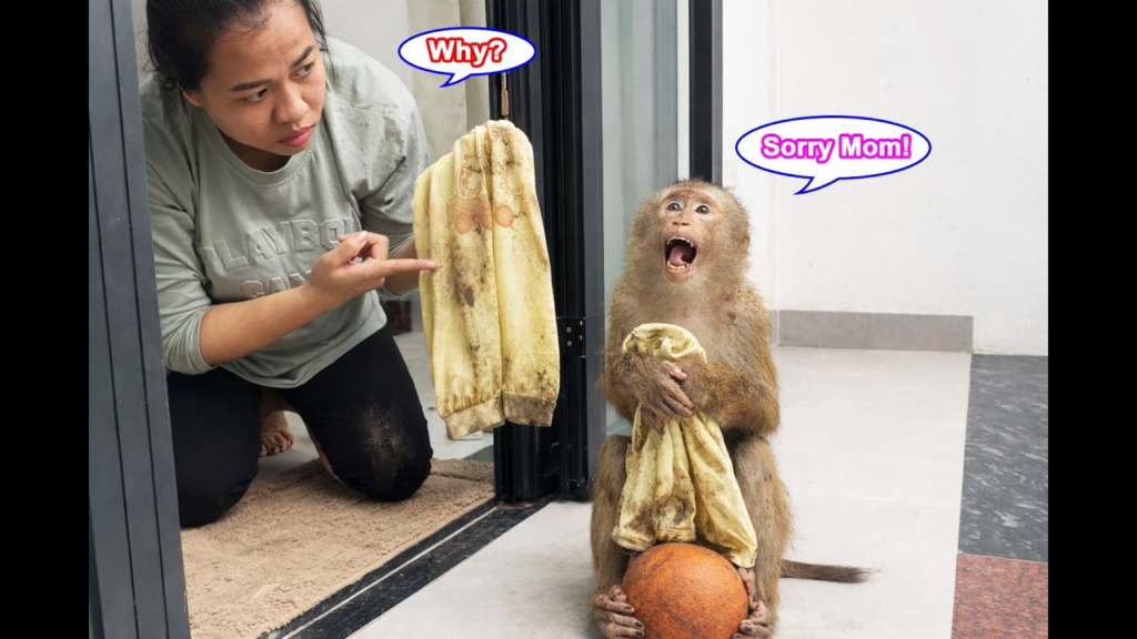 But Lyly’s mischievous fun didn’t stop there. Later, while Mom was cleaning the living room, Lyly decided to “help” by grabbing a pillow and fluffing it so hard that feathers floated everywhere like snow. She clapped happily and danced around the room, thinking it was the funniest game ever. Mom stood there speechless, covered in feathers, wondering how such a tiny monkey could create such a giant mess.