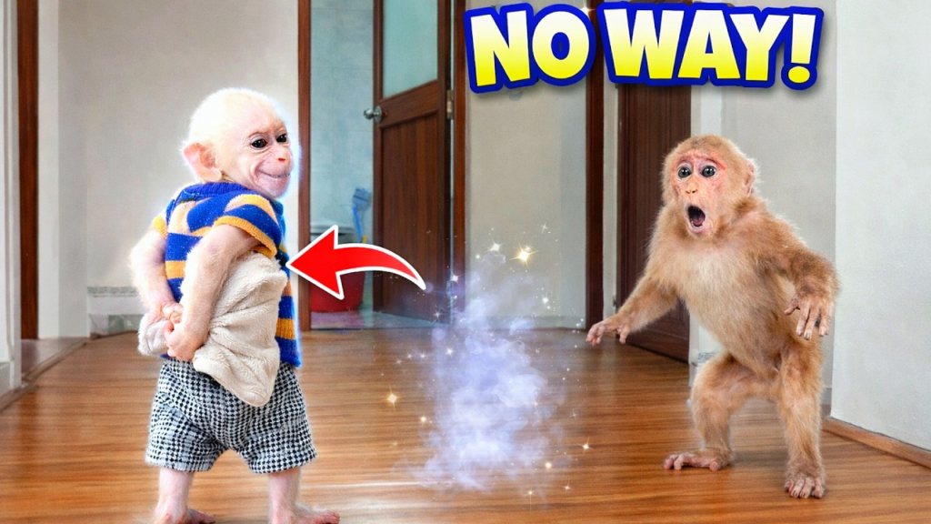 At first, Bibi looked surprised, but then he realized it had all been Lala’s silly prank. Instead of getting upset, he started laughing too. Soon the two little monkeys were happily chasing each other around the room, turning the prank into a fun game.