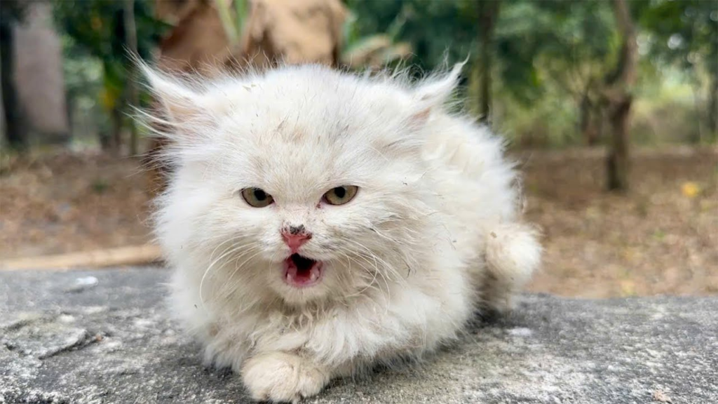 A group of kind rescuers happened to pass by the old house when they noticed the heartbreaking sound. At first, they could hardly believe such a tiny voice was coming from inside the empty building. Carefully stepping through the cracked doorway, they followed the cries until they found the poor kitten curled up in a dusty corner. Its fur was dirty, its body was thin, and its frightened eyes showed just how long it had been struggling alone.
