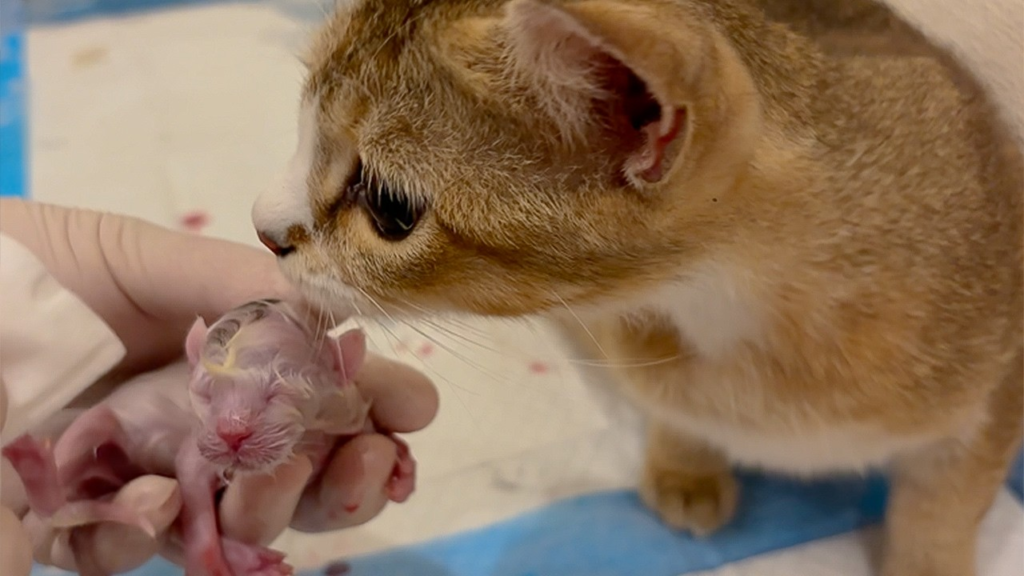 After a long and painful effort, the first kitten was finally born. The mother cat immediately turned to clean the tiny newborn, her motherly instincts shining beautifully despite her exhaustion. But there was no time to rest—more kittens were still coming. She continued pushing with all her strength, pausing only for short moments to catch her breath.