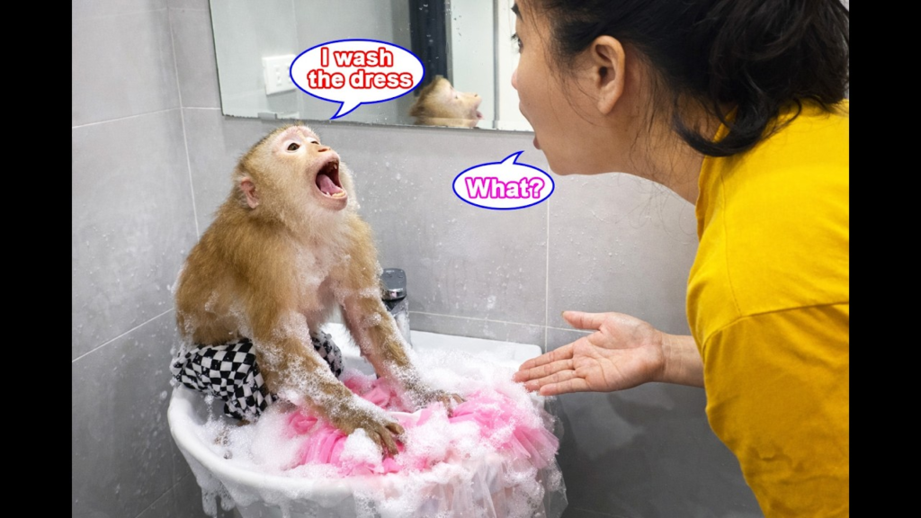 The morning began quietly, but it quickly turned into a scene of pure comedy when Monkey Lyly decided it was time to clean her beloved princess dress. She had worn it all day while playing, and by evening, the once-sparkling gown was covered in dust, fruit stains, and tiny smudges. Instead of asking for help, Lyly took matters into her own hands, determined to wash it all by herself.