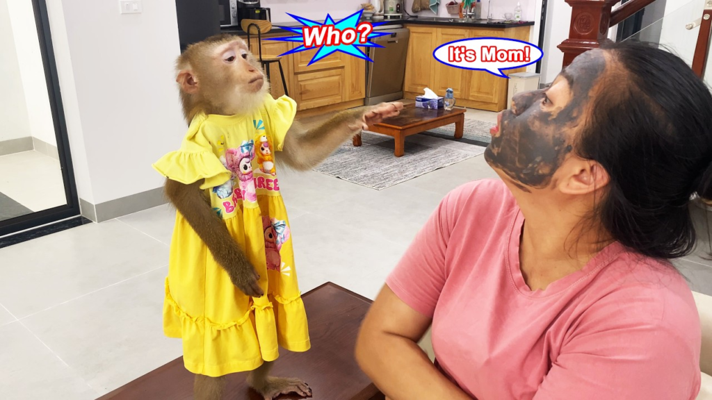 One sunny afternoon, little Monkey Lyly was happily playing in the living room with her favorite toys. She stacked colorful blocks, rolled her tiny ball across the floor, and giggled with joy. Her mother had been cleaning the house nearby and suddenly got a playful idea. She found a funny animal mask in the drawer, one with big round eyes and a silly smile. Quietly, she put it on and walked into the room to surprise Lyly.